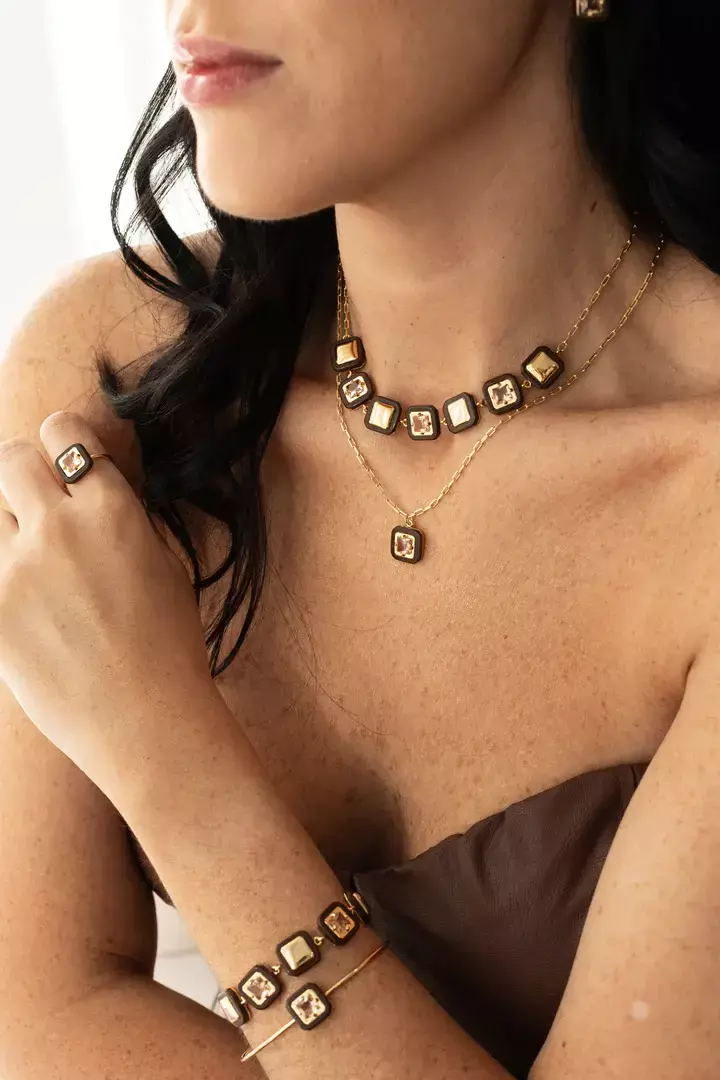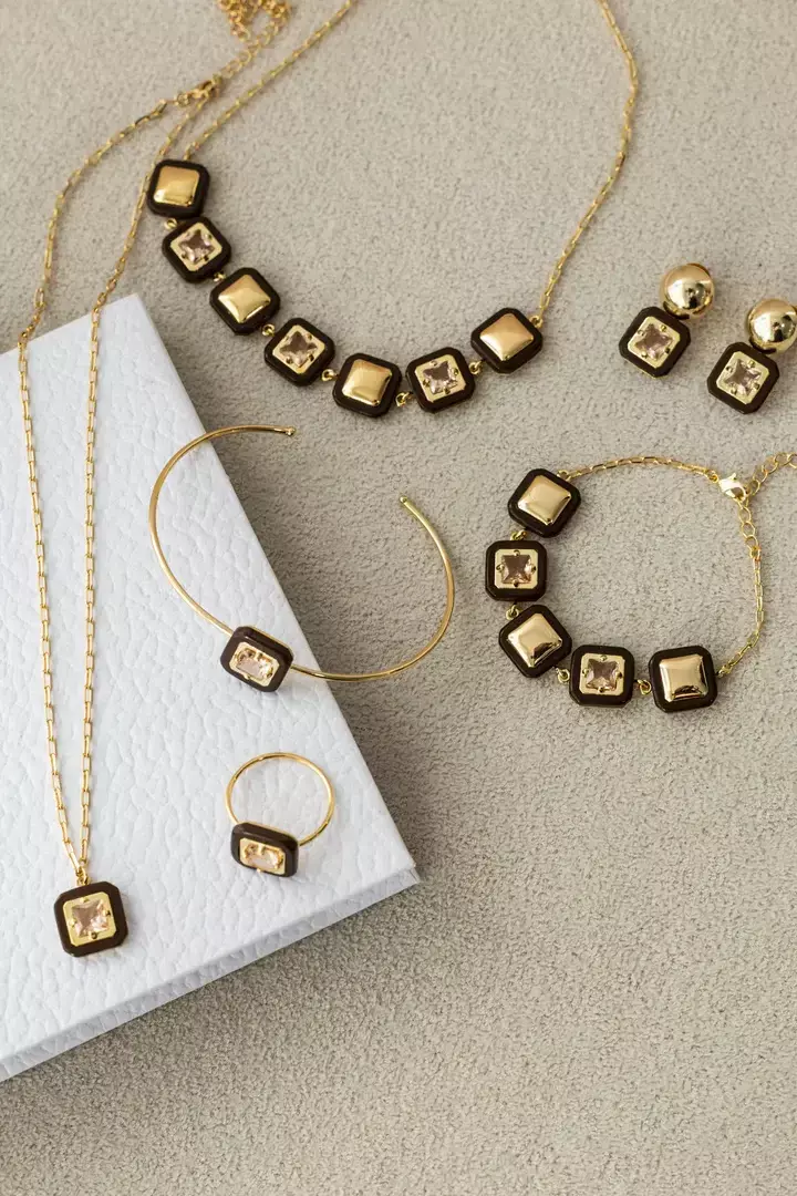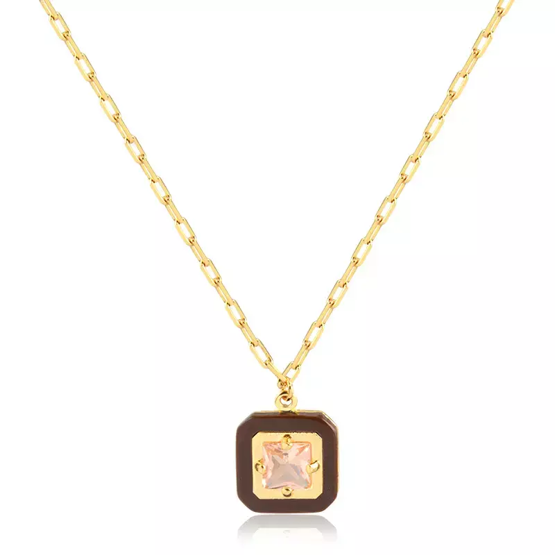 Colar Amour Corrente Quadrado Resinado Marrom Zirconia 40cm.